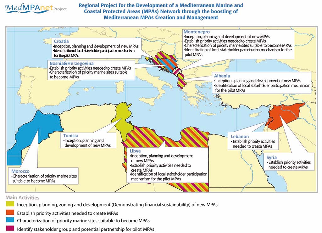 A set of activities will be implemented around 4 action categories:- Demonstration projects on MPAs creation and financial analysis and sustainability mechanism in Albania, Croatia, Libya, Tunisia and Montenegro,